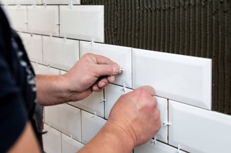 Hack walls for grip, apply waterproof slurry + polymer mortar (1:4), lay tiles level with 2–3mm spacers in stack or offset bonds, grout with epoxy for water-tight seals.